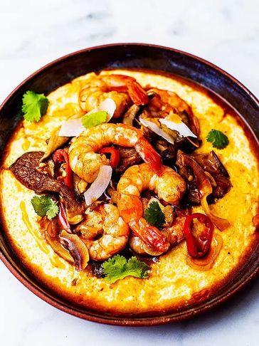 Spoon a generous portion of creamy grits into serving bowls. Top with the vindaloo shrimp mixture. Garnish with chopped cilantro or parsley. Serve with lemon wedges on the side for a bright, citrusy finish.