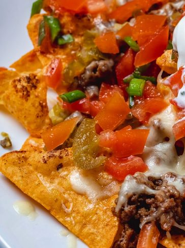 Preheat your oven to 375°F (190°C). On a large baking sheet or oven-safe platter, spread a layer of tortilla chips (or naan chips). Sprinkle half the cheese over the chips and add half of the pork vindaloo over the cheese. Repeat with another layer of chips, cheese, and pork. Bake 8-10 minutes. Add preferred toppings (tomato, red onion, pickled onion, cilantro, sour cream or Greek yogurt).